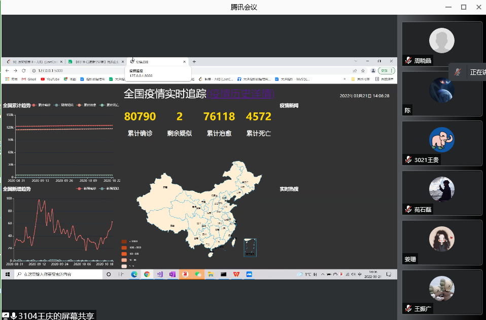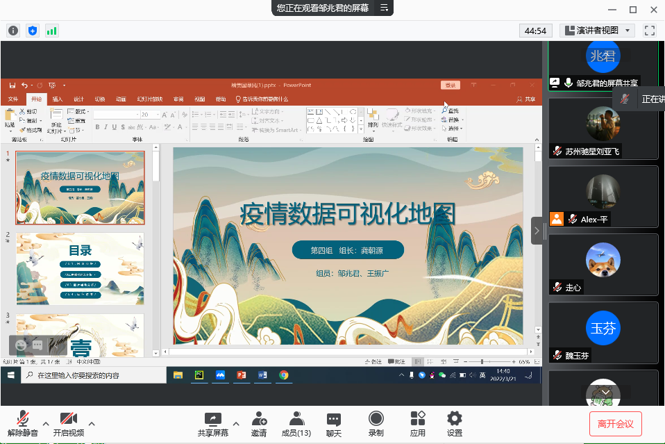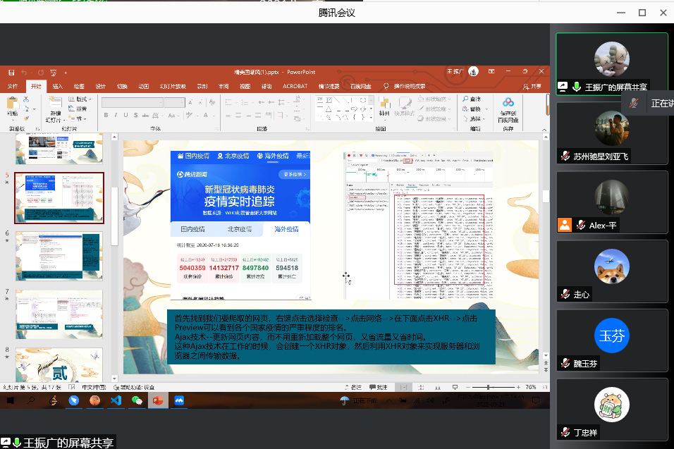 在项目实现之后,周晓晶老师又组织了结课答辩,让同学门把自己的项目相关内容以及小组的任务分配制作成ppt,利用腾讯会议进行项目汇报,周晓晶老师以及苏州驰星的詹亮老师和刘亚飞老师在汇报中,指出了同学们的优点和不足,给予了最为细心的指导,让同学们对python爬虫、ppt的制作有了更为深层次的理解和体会。