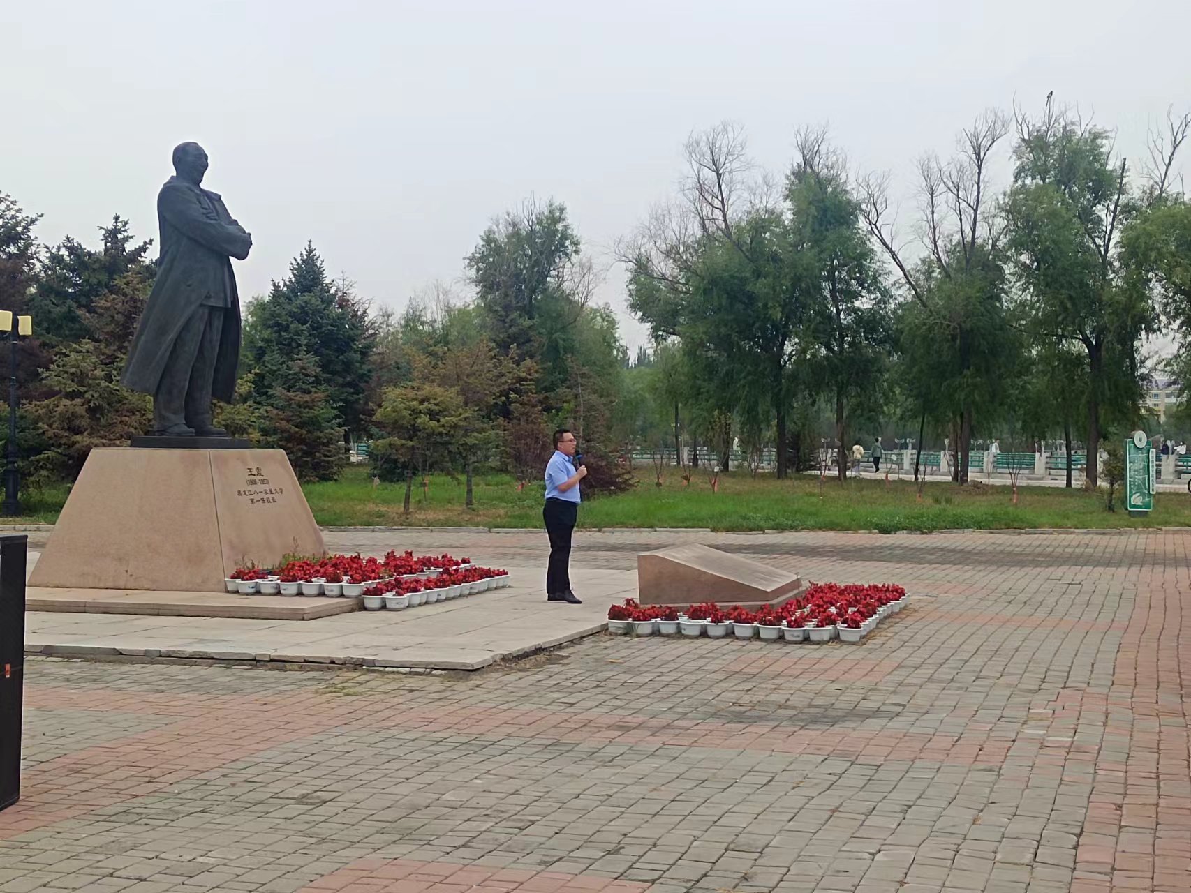 在将军广场王震将军像前,授课老师为全体新生讲述了老董事长王震将军生平事迹,北大荒精神的由来和八一农大的建校历程。北大荒精神是中国共产党人精神谱系的北大荒篇章,它激励着一代代拓荒者奋斗在新的征程上;激励着我们不懈奋斗,用青春、热血、生命去诠释和践行。