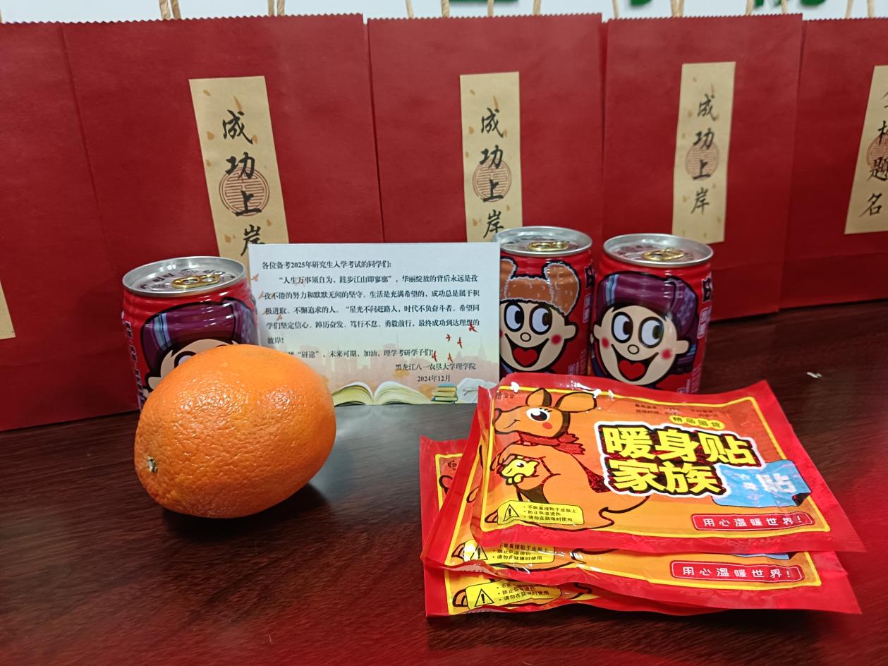 活动准备的现场温馨而热烈,公司领导、专业教师、班主任和辅导员们纷纷加入到这次暖心的祝福活动中,每一份考研加油礼包都是精心挑选出来的:暖宝宝伴你“温暖备战”;旺仔牛奶寓意“好运旺旺”;橙子寓意“心想事成”……不仅有装备的支持,更有亲切的关怀和美好的祝愿。